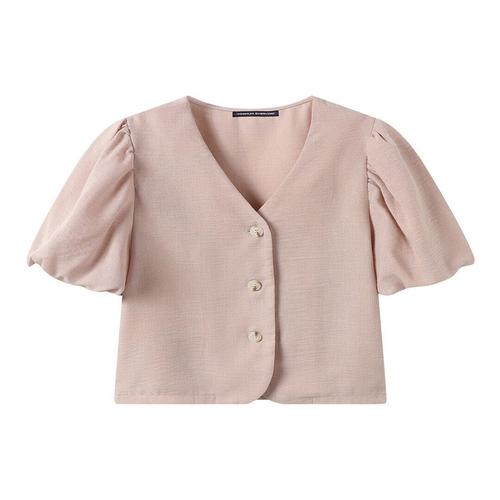ONM 모던 페미닌 퍼프소매 펀칭 노카라 셔츠