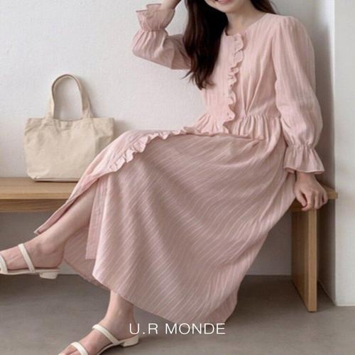 [유아몽드]여리여리 프릴 스트라이프 롱 원피스 라운드넥 퍼프