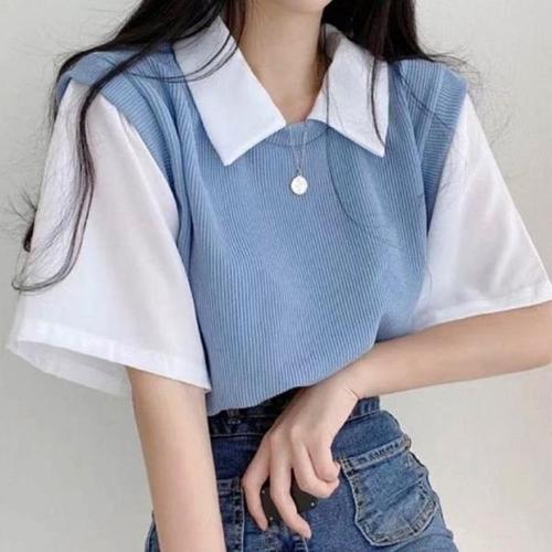 여자 페이크 셔츠 니트 조끼 레이어드 반팔티