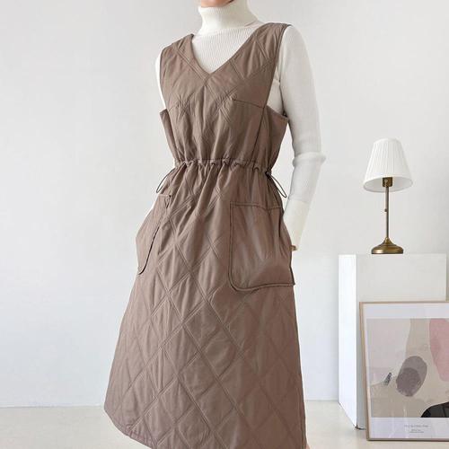 [옷자락] 여성 겨울 웰론 스트링 포켓 브이 나시 패딩 롱원피스