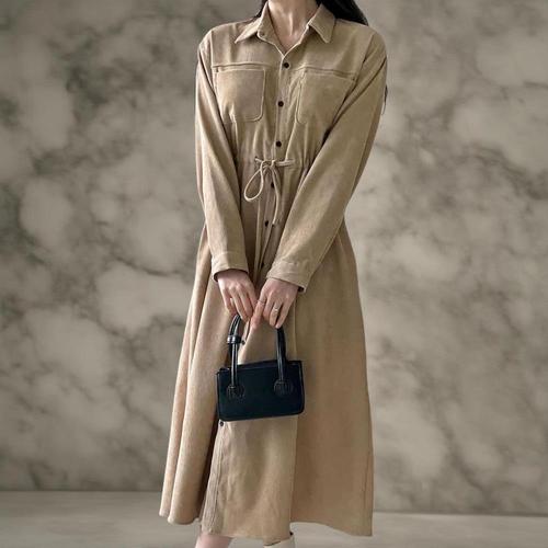 [옷자락]여성 잔골지 투포켓 스트링 카라넥 버튼 루즈핏 롱원피스