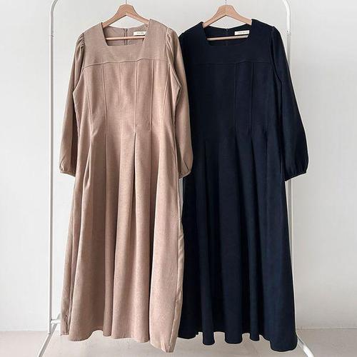 [옷자락]여성 핀턱 플리츠 스퀘어넥 가을 하객 롱 원피스 포켓 디자인