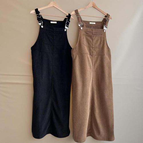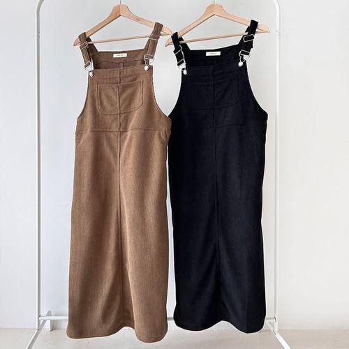 [옷자락]여성 골덴 멜빵 롱 원피스 포켓 포근한 기모 뒤트임 오버사이즈