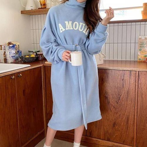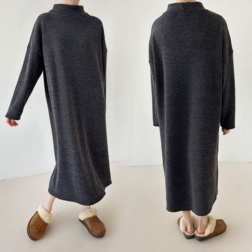 여성 반폴라 라운드 니트 원피스 미디 무릎 덮는 니트 롱 원피스