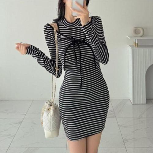 [옷자락]여성 스트라이프 목폴라 레이어드 미니 원피스