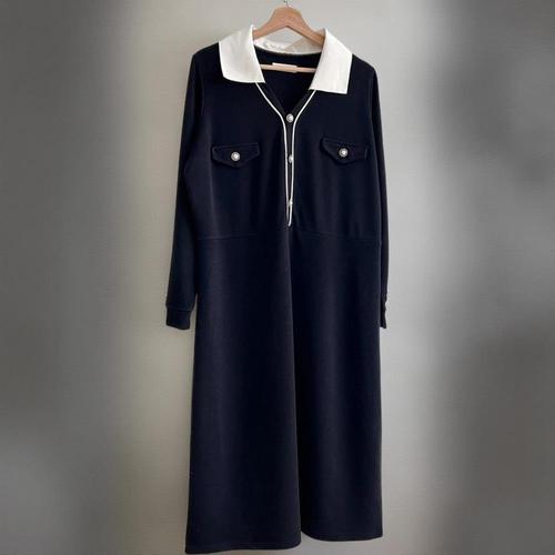 [미라클세븐]여성 겨울 하객룩 빅사이즈 진주 장식 배색 카라 롱 드레스