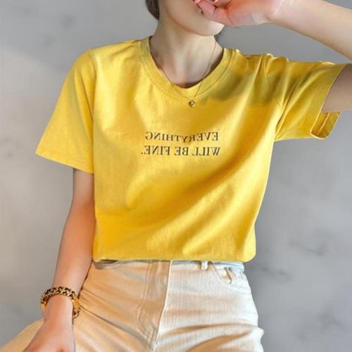 [옷자락] 여성 심플 문자 프린트 폴리 스판 라운드넥 반팔 티셔츠