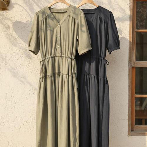 [옷자락]여성 여름 폴리 나일론 브이넥 셔링 원피스
