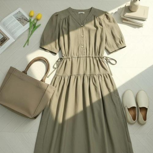 [옷자락]여자 시원한 폴리나일론 브이넥 셔링 티어드 원피스