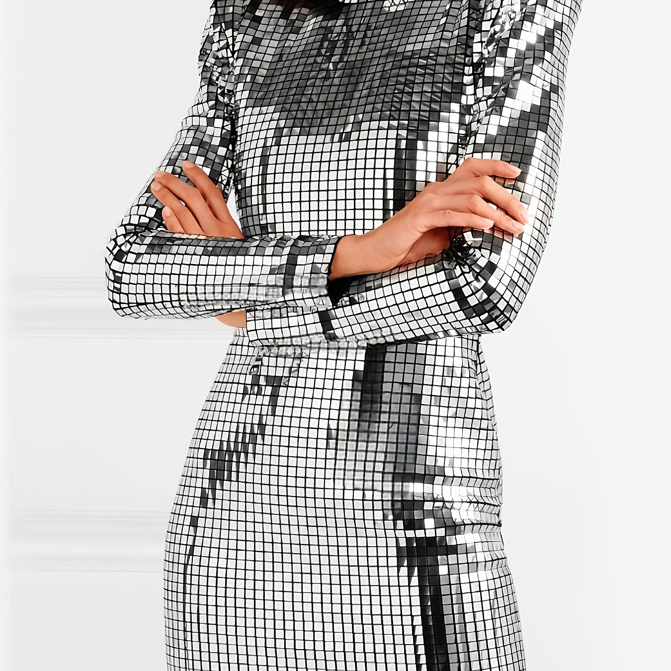TEMU 2026년 여름 신상 여성 드레스, 골드 포일 테크닉, 코팅된 사각 디자인, 긴소매, 하이넥, 핏 미니 드레스, 나이트클럽 및 파티 행사에 적합