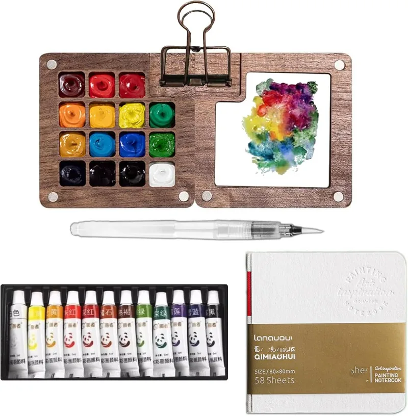 휴대용 수채화 세트 여행 팔레트 스케치북 브러쉬 펜 아티스트를위한 바인더 클립 학생 그림 도구 그리기 용품