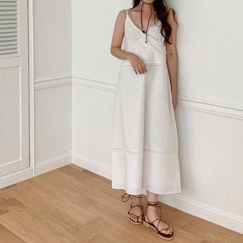 샵앤) 여성 밑단 펀칭 레이스 바스락 민소매 롱 원피스 MSE-WDR-20682-네이비