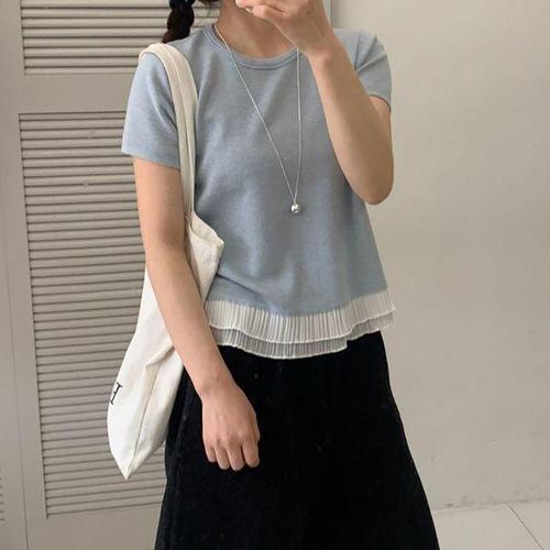 [에이치플러스몰]여성 반팔 니트티 플리츠 밑단 디테일 프릴 반팔