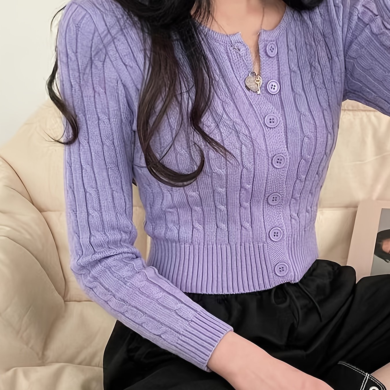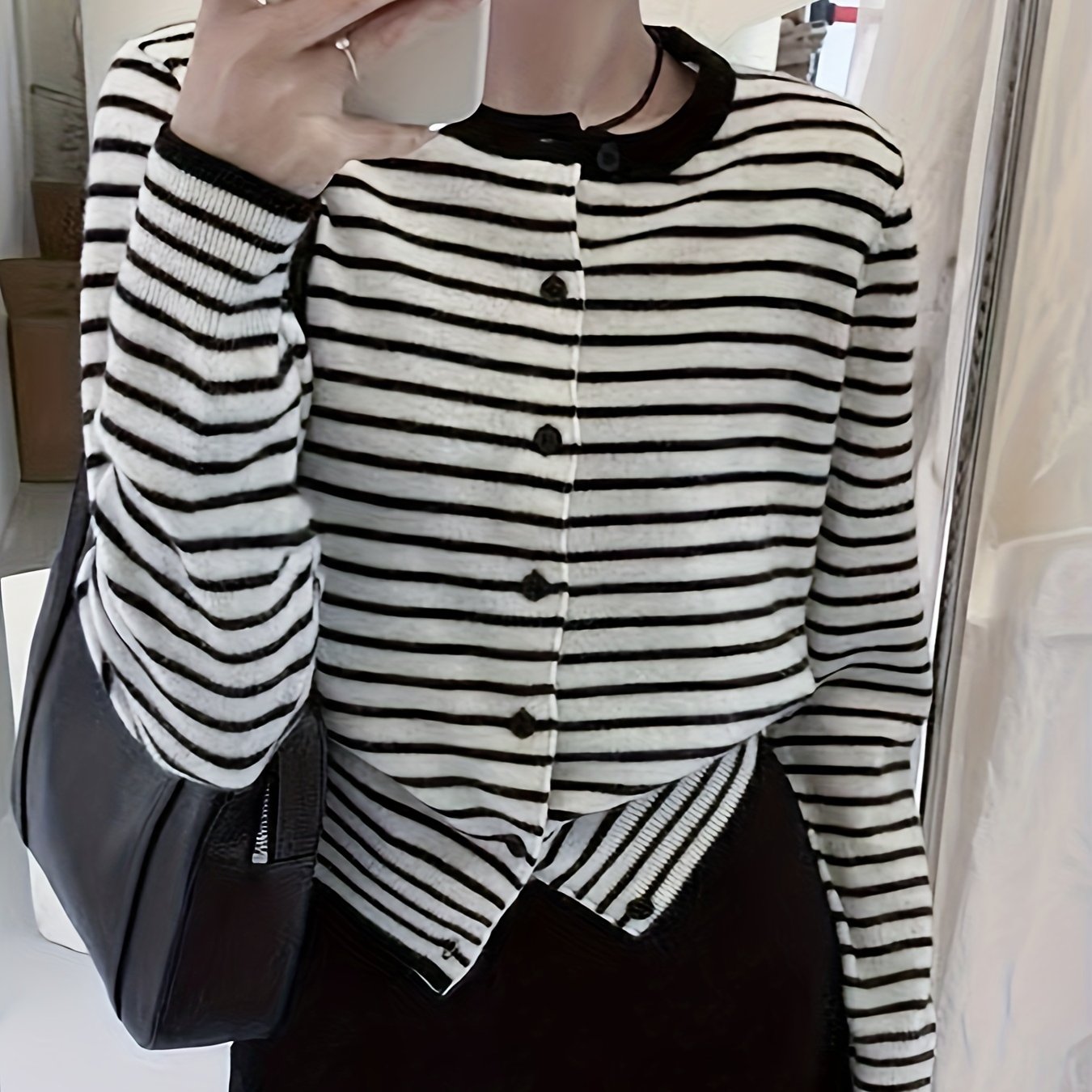 TEMU 여성용 코리안 스타일 고급 블랙 & 화이트 니트 가디건 - 부드러운 긴 소매 앞단추 가을/겨울 레이어링 아이템, 레귤러 핏 어깨 슬리밍 숏 탑, 오피스 캐주얼 시크 스타일, 가벼운 가디건 아우터, 세탁기 사용 가능|가디건|반팔니트