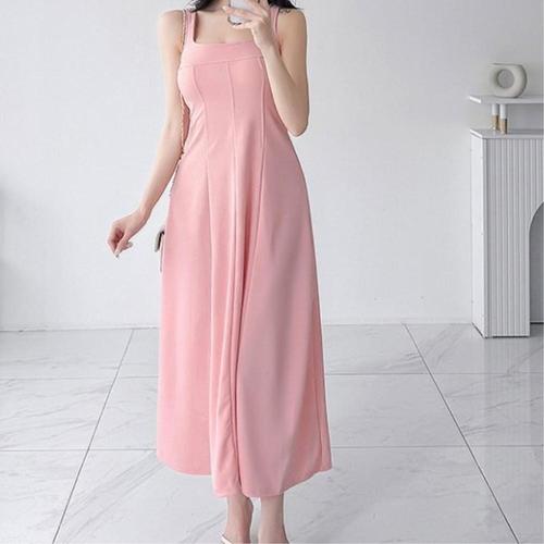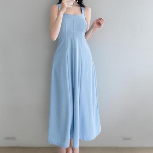 [미라클세븐]여성 핑크 블루 스퀘어넥 셔링 롱 원피스 나시 절개 디자인