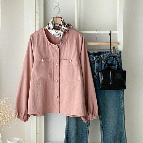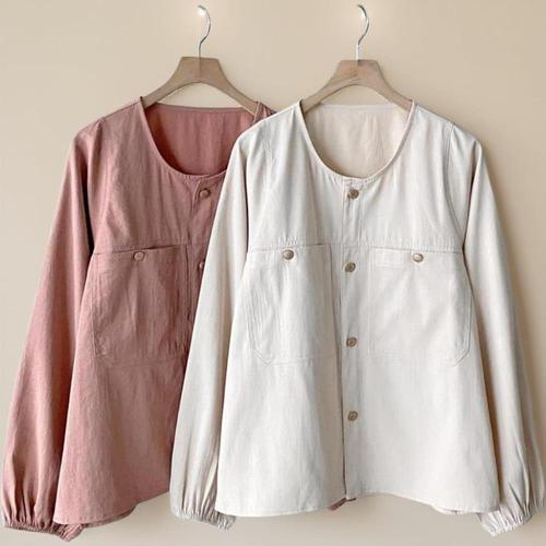 [미라클세븐]여성 베이지 핑크 두 개 포켓 버튼 라운드넥 긴팔 블라우스