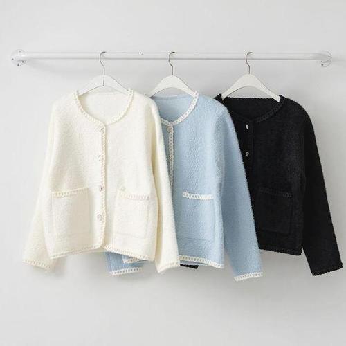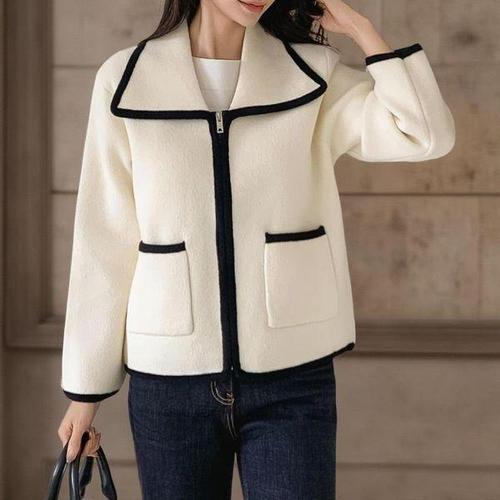 [신상오픈런]여성 배색 큰카라 하프 니트 자켓 가을 하객 패션 포켓