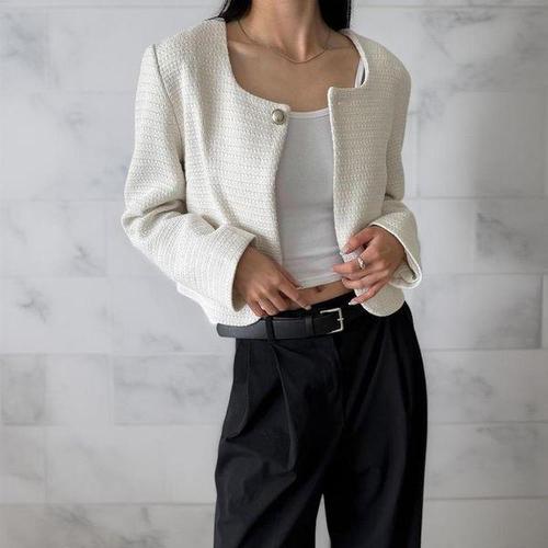[옷자락] 여성 가을 하객 패션 트위드 단추 볼레로 크롭 울 재킷