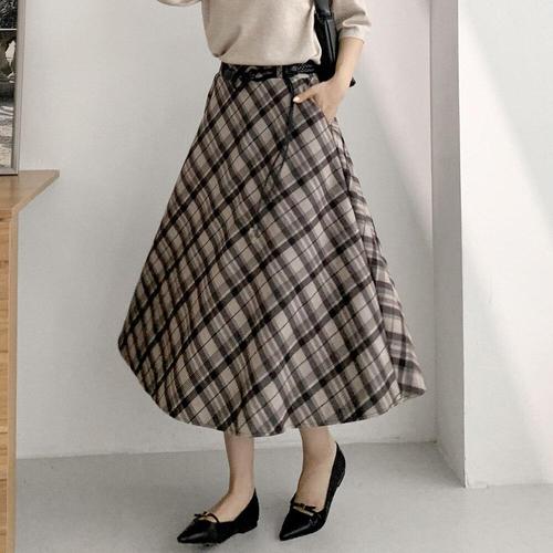 [미라클세븐]여성 가을 하객 패션 체크 벨트 플레어 롱 스커트