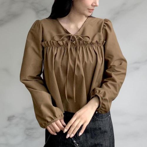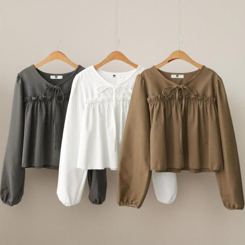 [옷자락] 여성 가을 하객 패션 리본 장식 프릴 크롭 러블리 블라우스