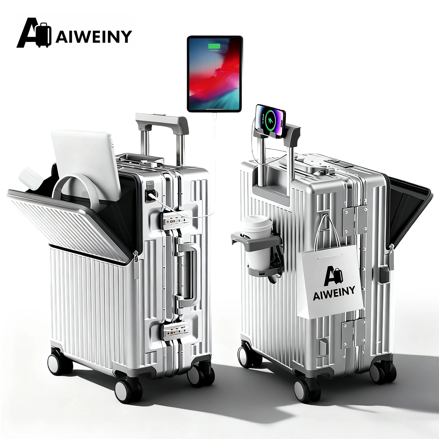 AIWEINY 2025 알루미늄 프레임 수트케이스 PC 하드셸 압력 저항 여행용 가방, 360° 무소음 다방향 바퀴 가방, 컵 홀더 및 수납 선반, TSA 잠금장치 포함.