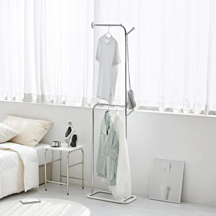 [하우스레시피] 바인 키 낮은 철제 스탠드 행거 크롬 - 행거 수납 긴옷 코너 미니 옷방 고정식 일자 벽