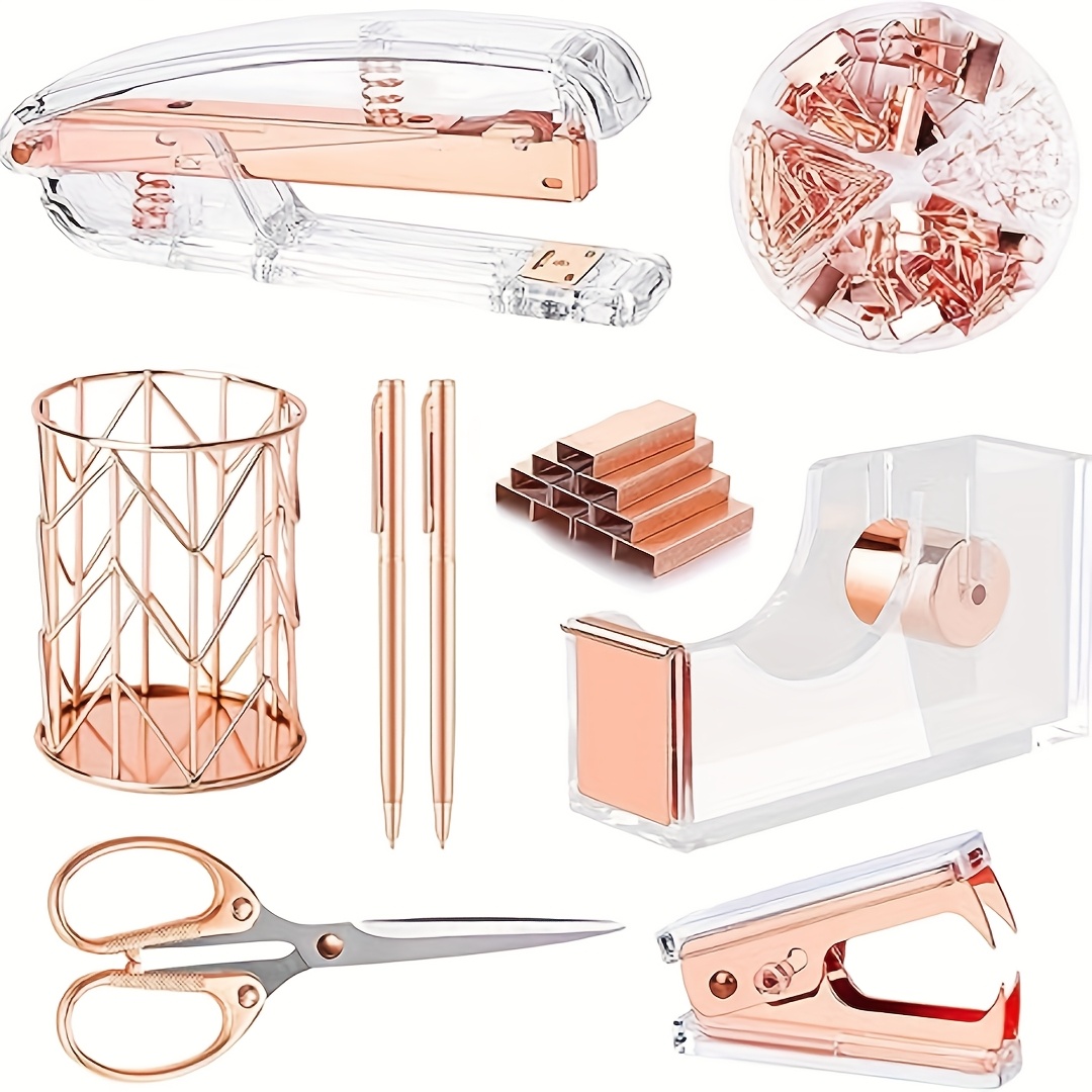 TEMU 9pcs Rose Golden Desktop Acssories Set, Offi Supplies Kit with Acrylic Stapler, Tape Dispenser, Ballpoint Pen, Scissors, Binder Clips/Paper Clips, and Staples, Suitable for Gifting