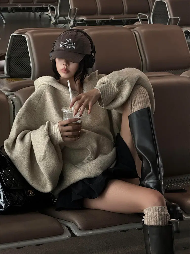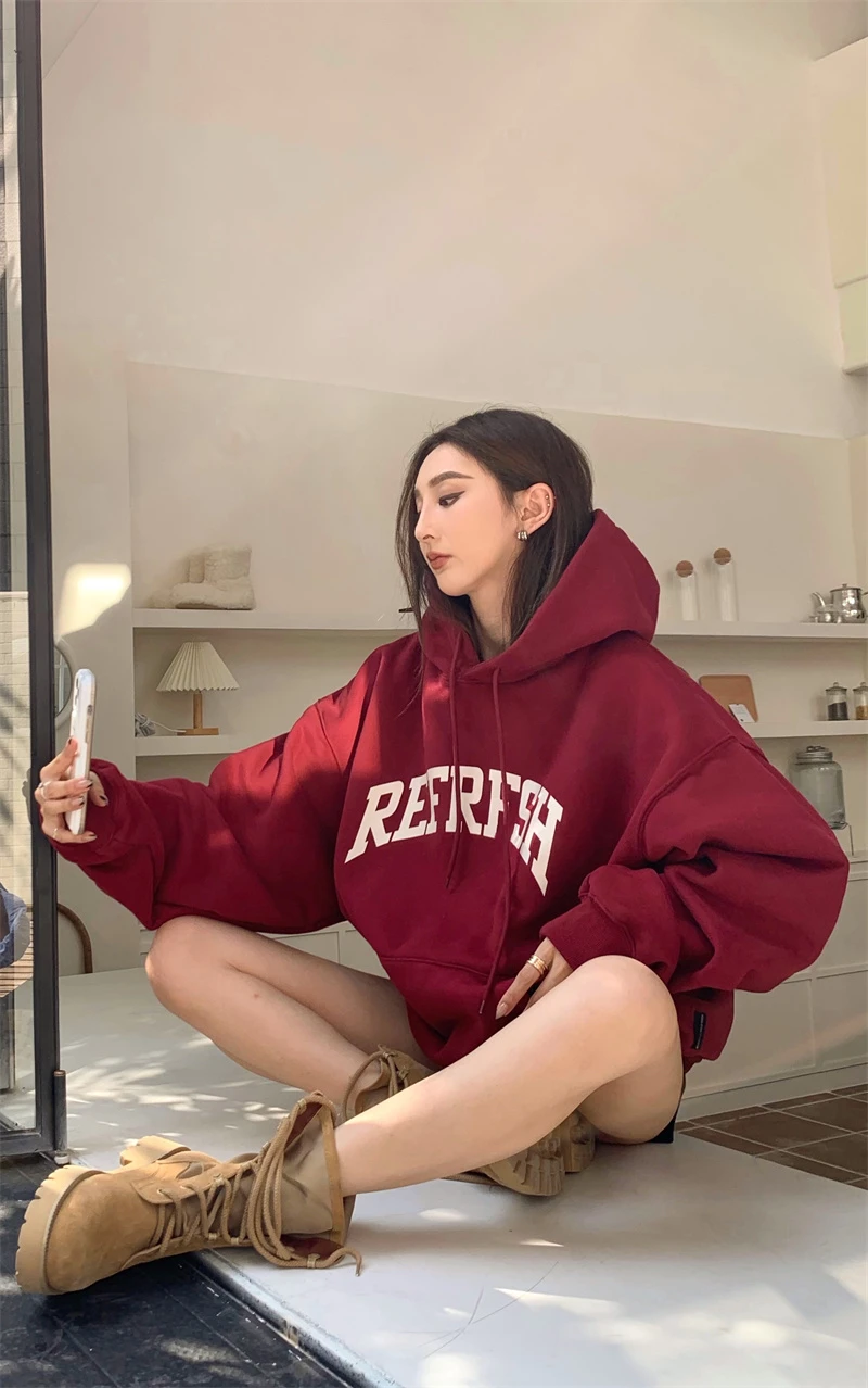 레트로 아메리칸 하이 스트리트 후디 여성용 가을 겨울 두꺼운 플리스 오버사이즈 레이지 스타일 탑 한국 버전 긴팔