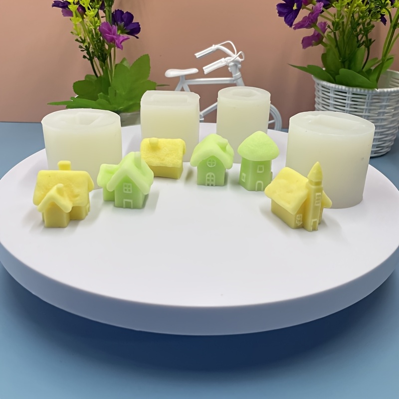 TEMU 4개 창의적인 집 모양 캔들 몰드 - 향초용 식품 등급 실리콘 미니어처 빌리지 장면 몰드, 석고 캔들, DIY 홈 데코 공예, 캔들 만들기용 몰드, 정교한 공예, 내구성 있는 공예 도구