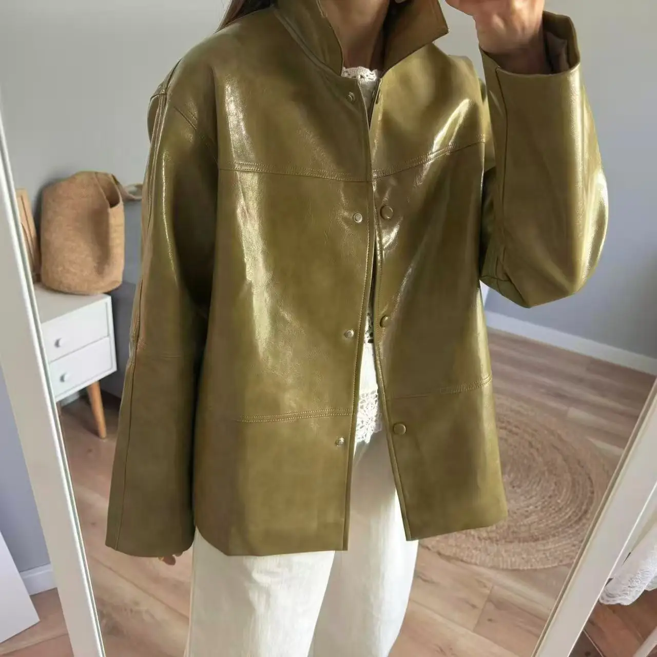 세련된 Pu 가죽 자켓 스탠드 칼라 느슨한 긴팔 코트 멋진 캐주얼 시크 다용도 겉옷 새로운 가을 여성 streetwear