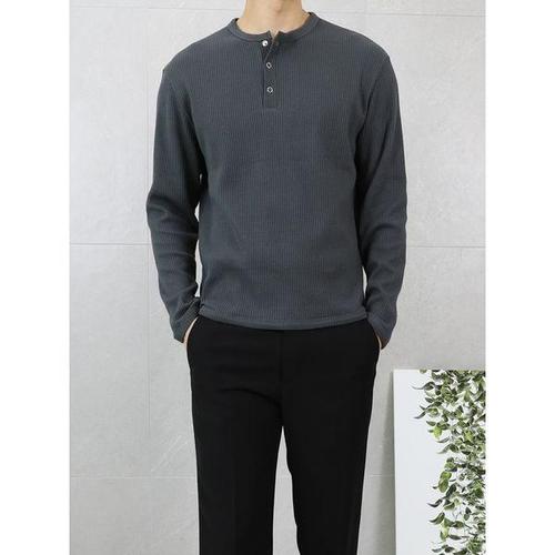 남자 와플 헨리넥 버튼 라운드 긴팔 티셔츠 OF-TSA-Q015-차콜