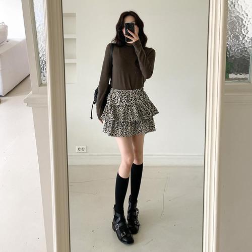 레오블리 하이웨스트 호피 레오파드 패턴 코듀로이 A라인 캉캉 티어드 미니스커트 (속바지) (2color)
