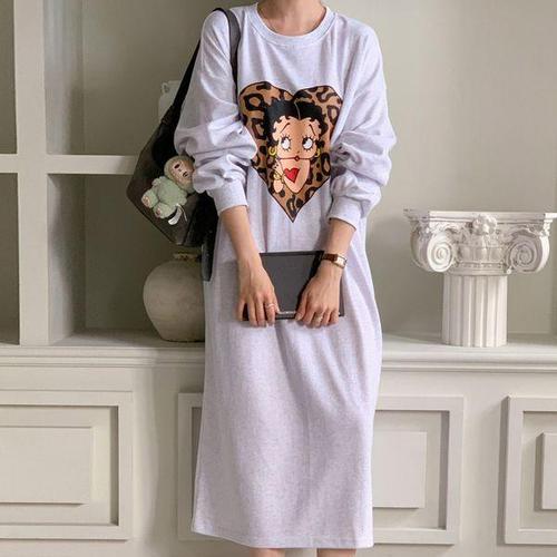 한국 봄가을 신상 패션 브이넥 기질 호피 프린트 루즈핏 캐주얼 퍼프 긴팔 원피스 여