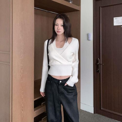 여성 니트 브이넥 숏탑 시크 디자인 심플한 홀터넥 원숄더 투웨이 착용 두꺼운 겨울 패션 여성복