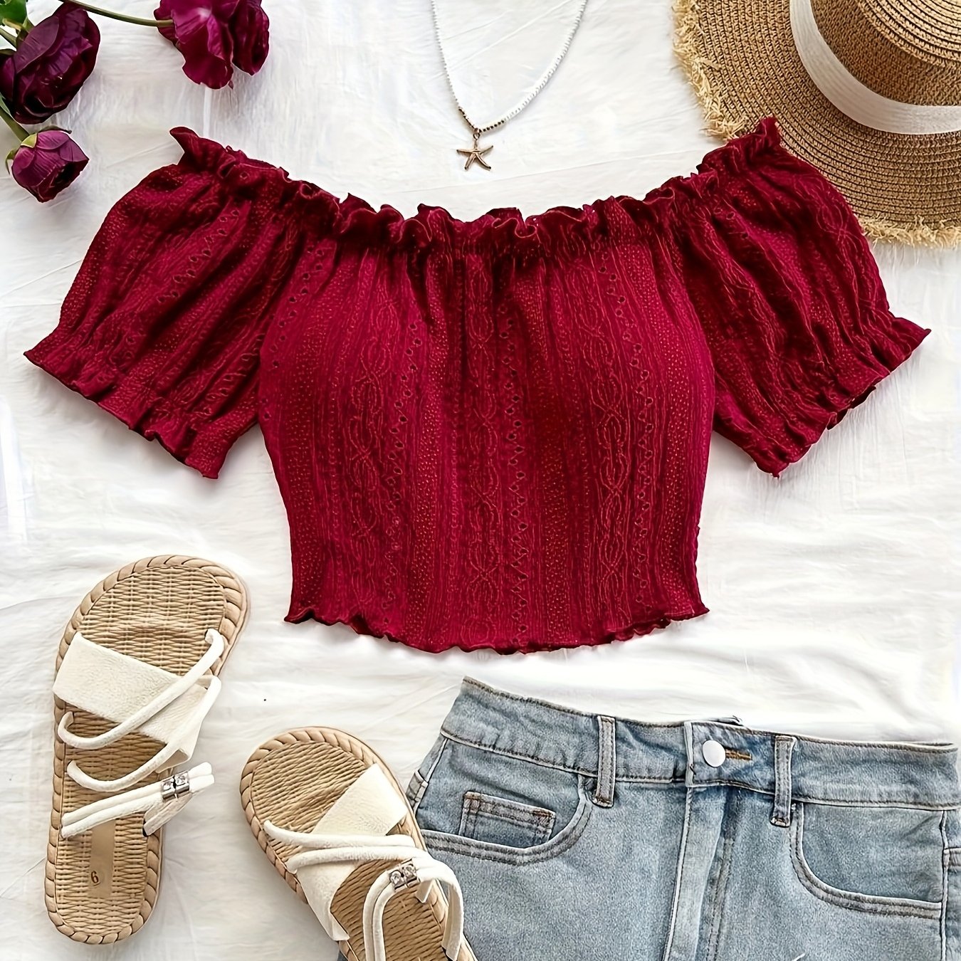 TEMU 여성용 오프숄더 러플 소매 티셔츠 - 조절 가능한 앞끈 디자인, 가벼운 여름 비치웨어 (레드/화이트), 음악 페스티벌 & 캐주얼룩, 핸드워시 전용, 루쉬 디테일, 편안한 착용감, 트렌디 블라우스, 휴가 및 축제 패션, 통기성 좋은 소재, 스타일리시 여성용 상의