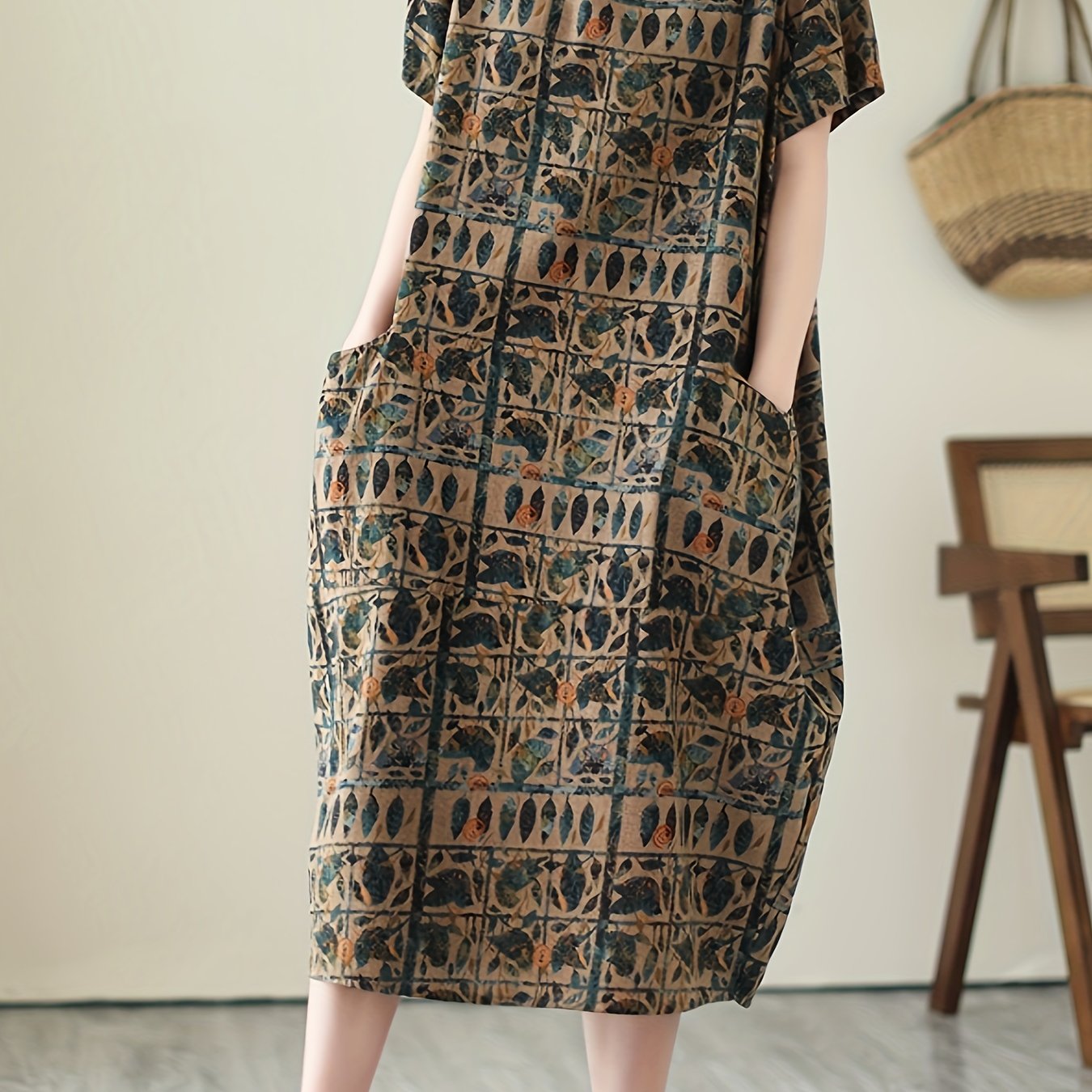 TEMU 여성용 우아한 중동 스타일 캐주얼 드레스 - 봄 여름 가을용 루즈핏 반팔, 식물 프린트 및 포켓 디자인, 기계 세탁 가능, 편안함 | 신축성이 없는 원단
