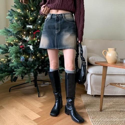 [옷자락]여자 워싱 캣브러쉬 A라인 청치마 흑청 가을 미니스커트