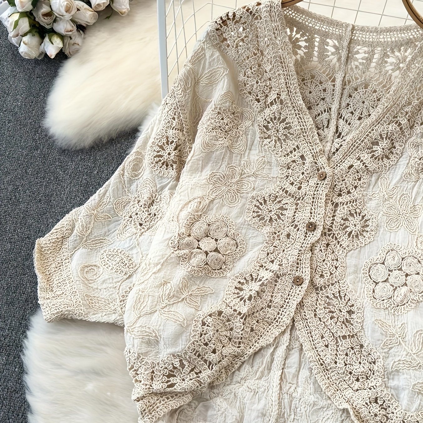 TEMU 새로운 여름 한국 스타일 V넥 레이스 장식 빈티지 할로우 아웃 스위트하고 스타일리시한 가디건 탑