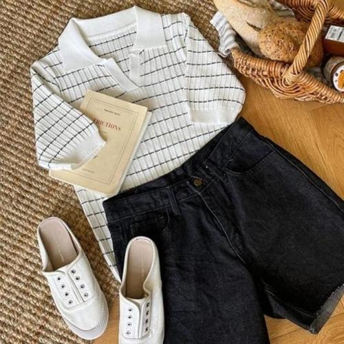 [브이와이][VY] 여자 카라 반소매 오픈 SS 미니멀리즘 단가라 니트_16903204_588847