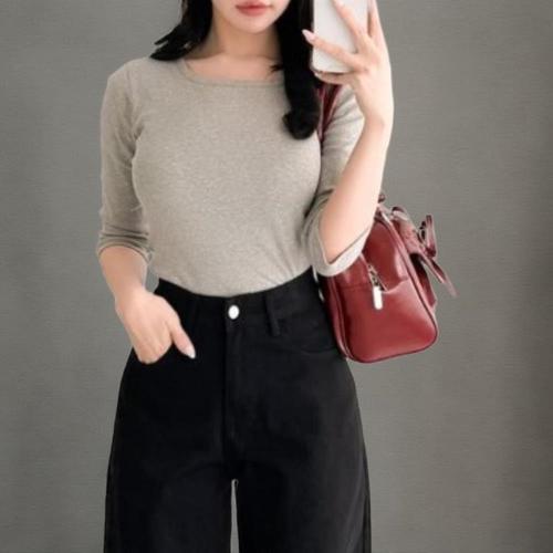 [비템]심플 미니멀 세미오버 슬릿넥 7부 티셔츠 3컬러 4사이즈