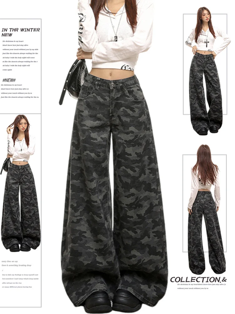 플러스 사이즈 여성용 아메리칸 하이 스트리트 카모플라주 와이드 레그 진 로우 웨이스트 루즈 스트레이트 슬리밍 팬츠 캐주얼 가을 의류