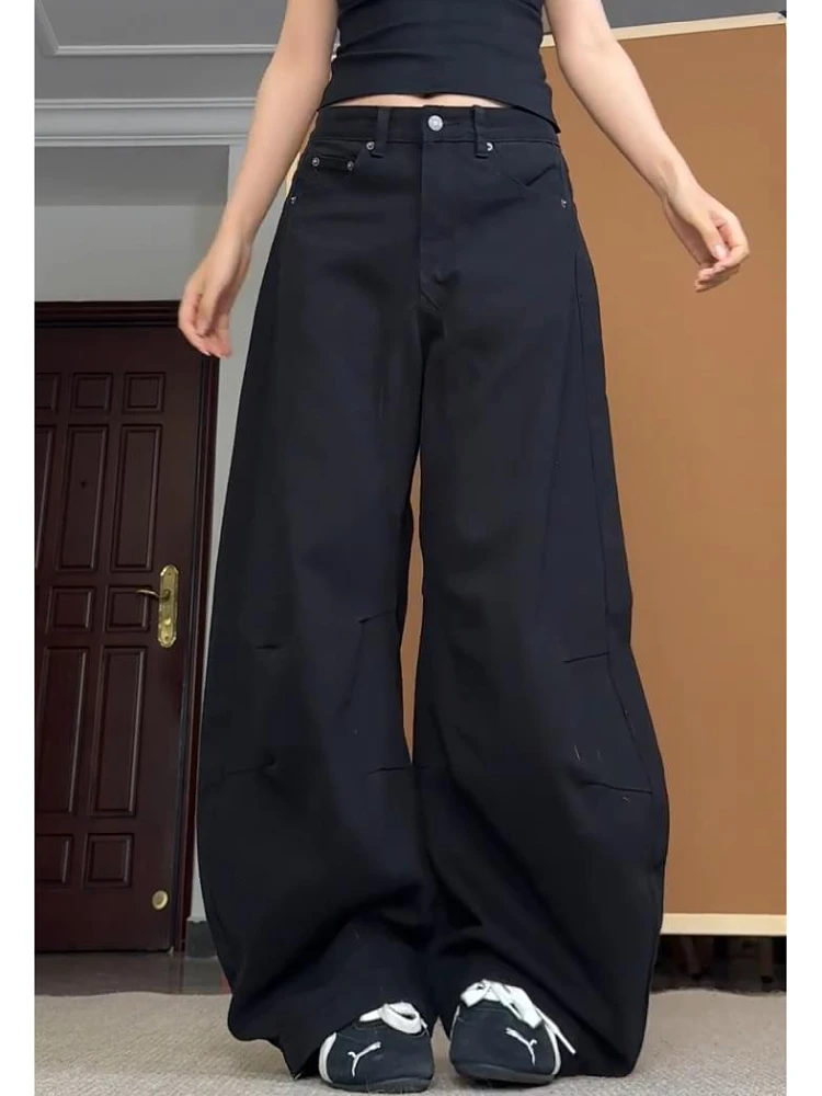미국 하이 스트리트 디컨스트럭티드 플리츠 진 여성 플러스 사이즈 슬리밍 루즈 와이드 레그 팬츠 드레이핑 플로어-랭스 트라우저