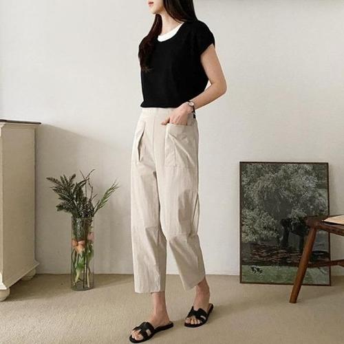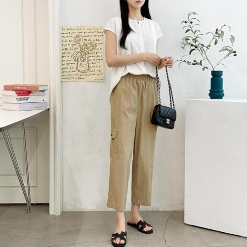 [브이와이][VY] 여자 버튼 SS 데일리 정장바지 9부 주머니 고무줄 팬츠_17157009_588847