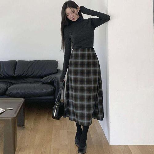 여성 로맨틱 정장 스커트 가을 겨울 모직 롱 하이웨스트 체크 A라인 트렌드 힛템