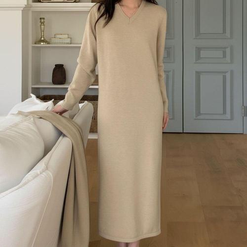 디어에이치 겨울 원피스 브이넥 니트 롱 H라인 부드러운 맥시 WFKVBLS