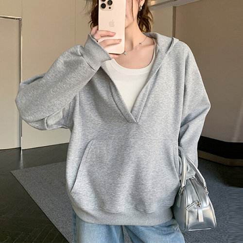 삼제태전가을 여성 상의 후드 빅사이즈 솔리드 브이넥 루즈핏 캐주얼 맨투맨