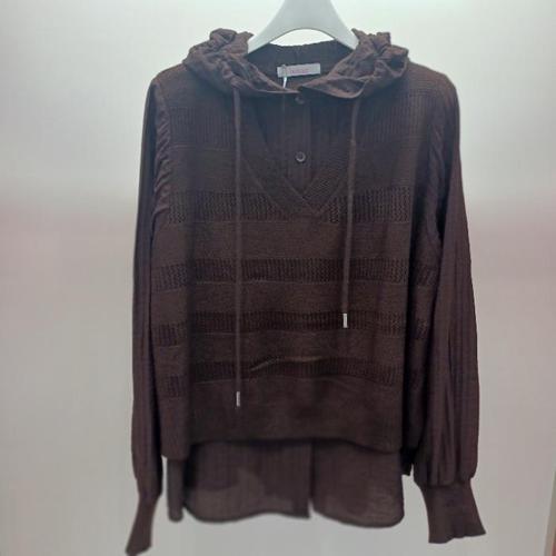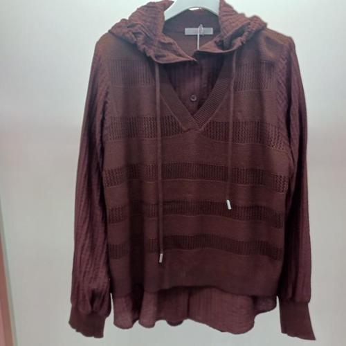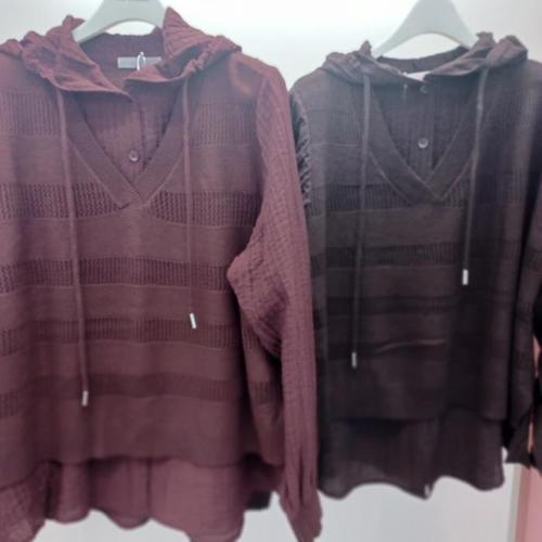 Latium HC06 엉덩이길이 브이넥 니트조끼 배색 가을느낌 후드 셔츠블라우스