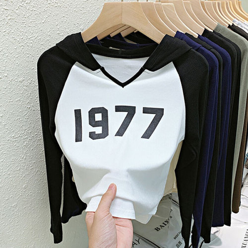 슈팅스타 / 브이넥 후드 레터링 슬림 숏 크롭 긴팔티 603529