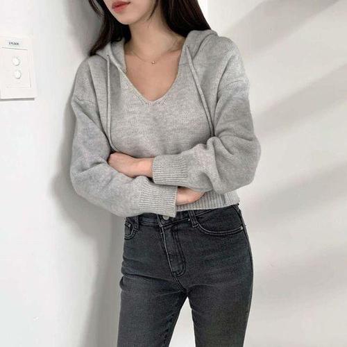 [다잇템]여성 캐쥬얼 롱슬리브 V넥 후디 짧은 니트