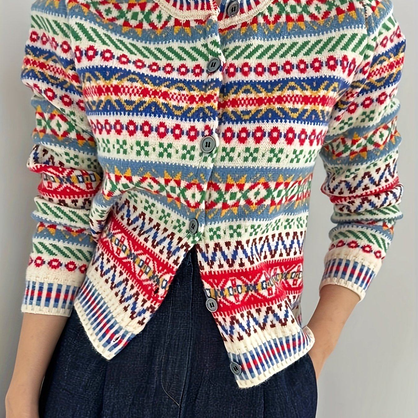 TEMU 레트로 에스닉 스타일 페어 아일 컬러풀 자카드 가디건 여성용, 소형 사이즈를 위한 숏 버전, 2025년 가을/겨울 레이어링에 완벽, 청순한 라운드넥 스웨터 디자인.|반팔니트